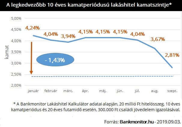 A 10 éves lakáshitelek kamata történelmi mélységbe zuhant a banki ajánlatokat összehasonlító Bankmonitor Lakáshitel Kalkulátor adatai szerint. Jelenleg akár 2,81%-os kamattal is hozzá lehet jutni egy 10 évre fixált kamatú lakáshitelhez, ami 15 ezer Ft feletti megtakarítást jelent havi szinten az adósoknak.